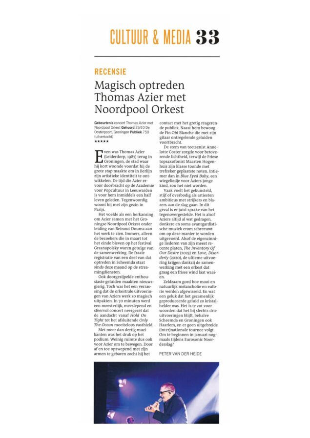 Douma, who founded the Noordpool Orchestra in 2010 to play his own compositions and arrangements, started out studying law in university, “because I thought music is not a way to make a living” but switched to jazz piano and, to make said living, found himself arranging music for shows and cabaret. “And I thought, I don’t want to spend the rest of my life [making] this entertaining music only. I have this background with classical music, although I don’t want to be a classical musician, because it’s not my vibe, I like improvisation. So I thought I want to have an orchestra that plays anything but classical music. You could say, in the 20th century, the rhythm section came into the orchestra, but in the 21st century, maybe even electronic instruments will start to collaborate more with orchestras. We had already an example in Holland that’s called the Metropole Orchestra, and I am a big fan of them. So I thought let’s try to found an orchestra that plays that kind of music.”
